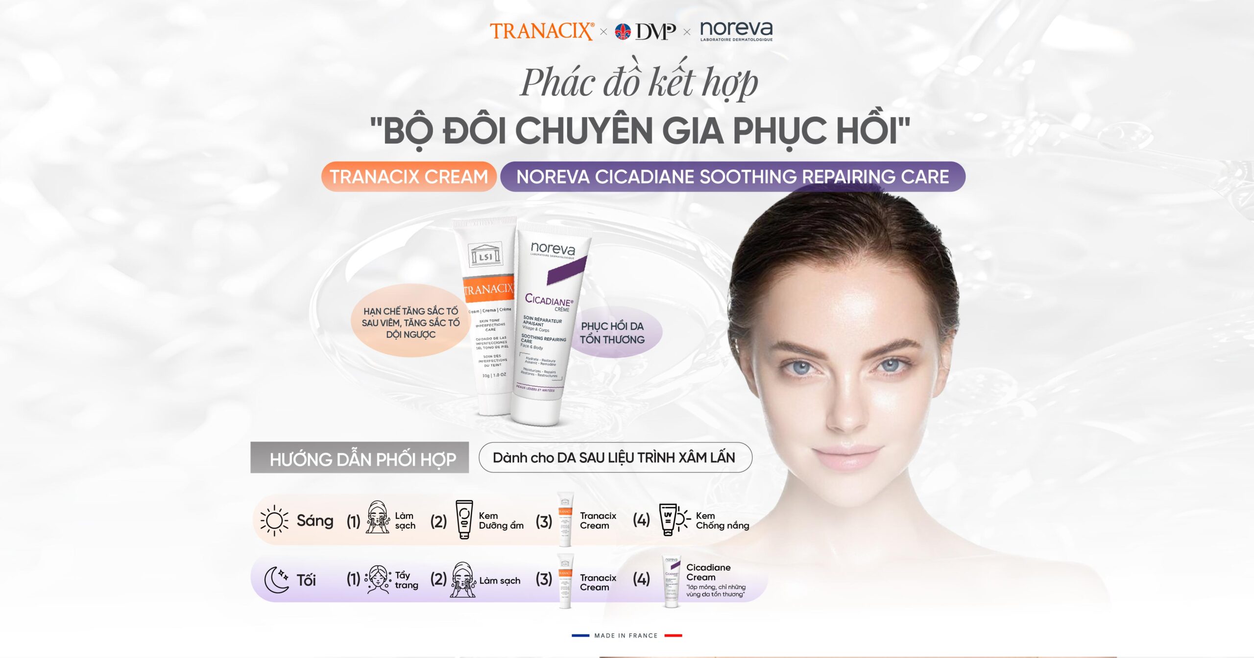 PHÁC ĐỒ KẾT HỢP “BỘ ĐÔI CHUYÊN GIA PHỤC HỒI”: TRANACIX CREAM – NOREVA CICADIANE REPAIRING CARE